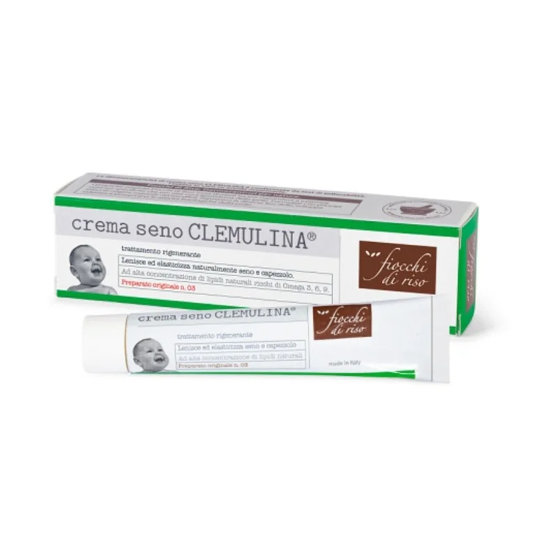 Fiocchi di Riso Crema Seno Clemulina è un trattamento rigenerante pensato appositamente per le mamme che allattano. La formulazione ricca di lipidi naturali, di Omega-3, 6, 9, elasticizza, idrata e rinforza le zone sensibili di seno e capezzolo, prevenendo la comparsa di ragadi e screpolature. Il trattamento aiuta anche a risanare la pelle irritata e a ripristinare l'integrità della barriera cutanea limitando gli stadi di secchezza locale. Dermatologicamente testata anche sulle pelli più sensibili e sull'areola mammaria. Senza ossido di zinco.