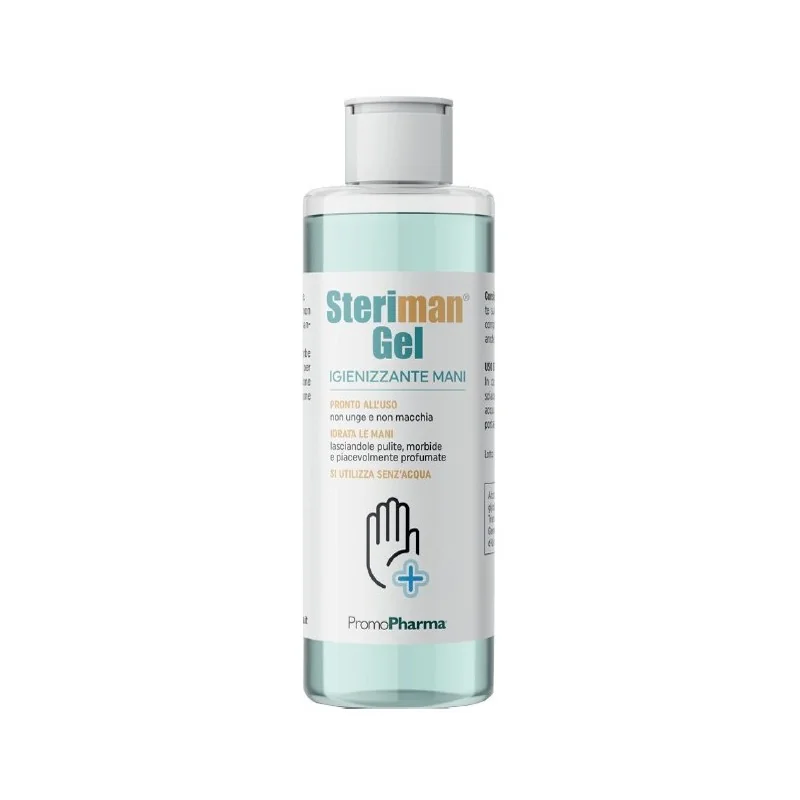 Gel igienizzante mani ad uso frequente, non aggressivo in quanto, grazie alla base idroalcolica di cui è composto, a differenza della normale saponetta non aggredisce e non elimina il manto protettivo della pelle. Grazie ai suoi ingredienti ha proprietà antimicrobiche, in grado di uccide germi e batteri in maniera rapida. Questo gel non richiede risciacquo, non unge, non macchia ed è di rapido assorbimento. È in grado di idratare la pelle lasciando le mani pulite, morbide e piacevolmente profumate. Grazie alla comoda confezione, Steriman gel è inoltre molto pratico ed ideale per igienizzare le mani in ogni situazione della giornata se non si dispone di acqua e sapone, come ad esempio sui mezzi pubblici, in aeroporto, dopo aver maneggiato denaro, per igienizzare le mani del nostro bimbo in modo che non corra rischi se si porta le mani alla bocca. Steriman gel è comodo ed efficace anche in casa per rinfrescare le mani, igienizzarle prima di cucinare e per rimuovere allo stesso tempo gli odori sgradevoli sulla pelle.