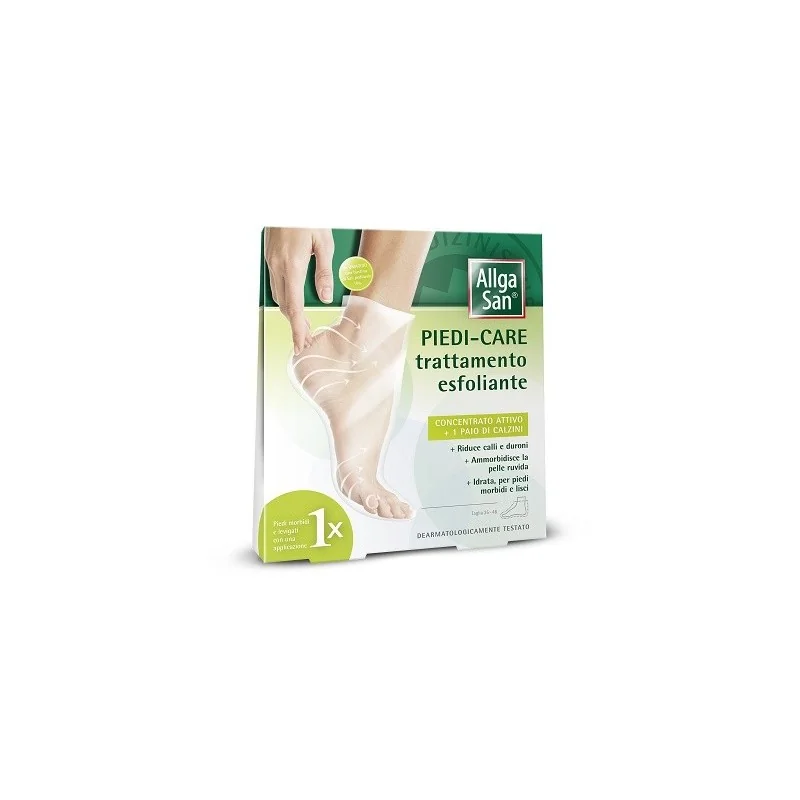 Se necessario rimuovere lo smalto dalle unghie e togliere eventuali gioielli. Detergere con acqua e sapone, e asciugare accuratamente i piedi prima del trattamento. Tagliare la bustina con attenzione, versare il contenuto liquido nel calzino che si trova all‘interno della confezione – Una bustina per ogni calzino. Indossare i calzini con il liquido all‘interno, e chiudere alla caviglia con l‘apposito punto colla. Per un maggiore comfort, sovra indossare calzini in cotone antiscivolo. Lasciare in posa per 60 – 90 minuti, togliere e gettare i calzini, dopodiché lavare i piedi con acqua e sapone. Dopo 2 settimane i piedi appariranno morbidi, lisci e setosi. Il trattamento può essere ripetuto dopo 30 giorni. Fare un caldo pediluvio, con AllgaSan Sali per Pediluvio, durante le 2 settimane può favorire il processo di esfoliazione. Consigliato l'utilizzo quotidiano della Crema Balsamo Piedi AllgaSan nelle due settimane successive all‘applicazione di PIEDI CARE trattamento esfolinate. È consigliato l'utilizzo di PIEDI CARE trattamento esfoliante con l‘arrivo della bella stagione, oppure 2 settimane prima delle tue vacanze.
