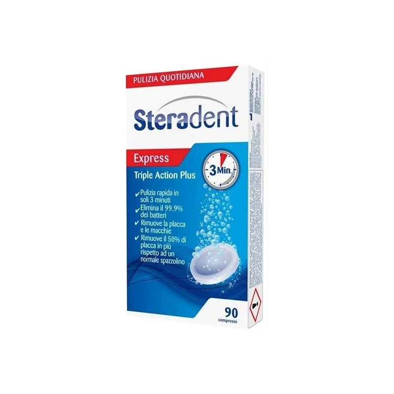 Le Steradent Triple action plus sono compresse effervescenti ad azione igienizzante studiate per una pulizia accurata di dentiere sia totali che parziali.
