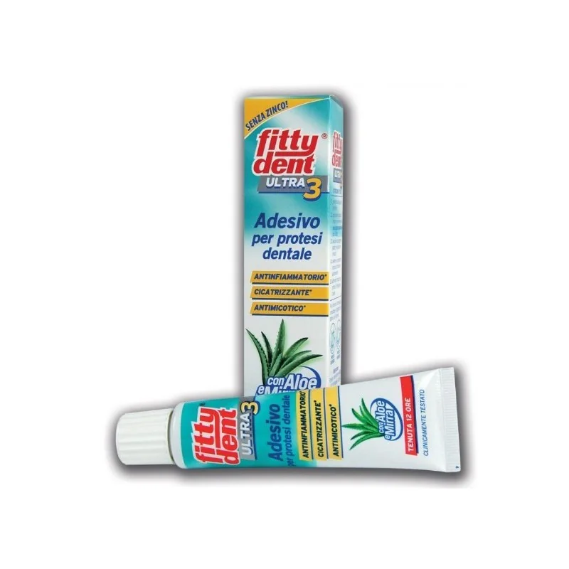 Pasta adesiva per protesi mobili con Aloe Vera e Mirra, a tripla azione. Antimicotica perchè crea una barriera contro le infiltrazioni di residui di cibo ed aiuta a proteggere le mucose dalla colonizzazione di funghi e batteri Antiinfiammatoria in caso di gengive irritate grazie all'effetto cuscinetto ed alle proprietà lenitive dell'Aloe Vera Fittydent Ultra 3 favorisce la regressione dell'infiammazione. Cicatrizzante in quanto coadiuva il processo di cicatrizzazione gengivale efficacemente, per una guarigione ancora più rapida. Inoltre la formula brevettata di Fittydent con due principi attivi garantisce una tenuta ed un'adesione straordinaria di 12 ore che da sicurezza a te ed al tuo sorriso.