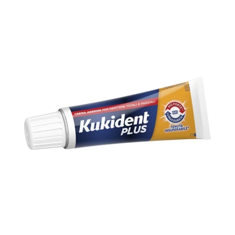 Kukident Plus Doppia Azione Crema Adesiva Dentiere è un prodotto che garantisce una forte tenuta a dentiere e ponti mobili tutto il giorno.