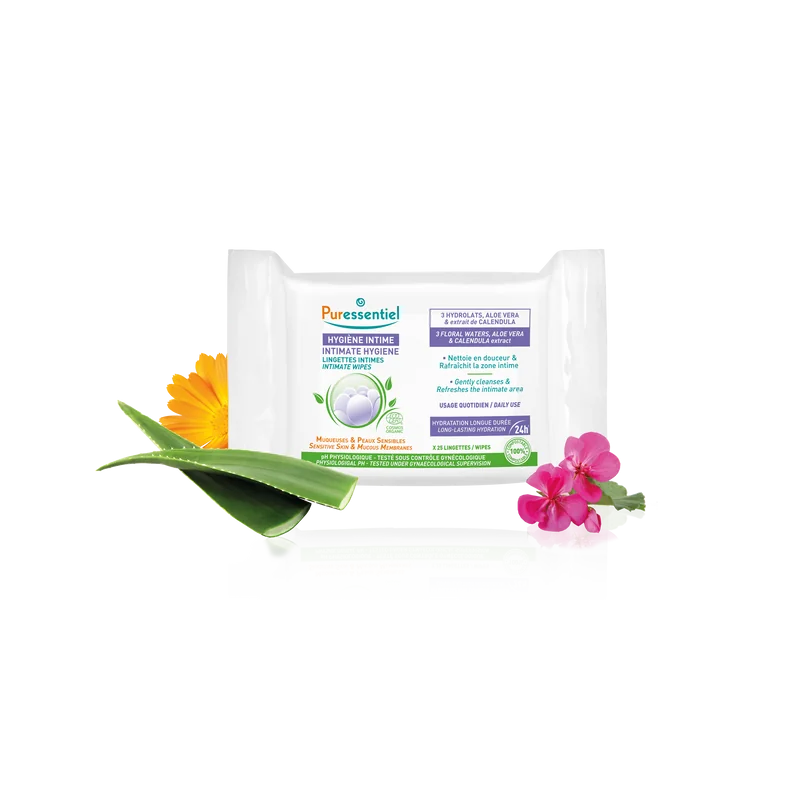 Usare le salviettine intime Puressentiel per detergere le zone intime in qualsiasi momento della giornata, senza risciacquo.