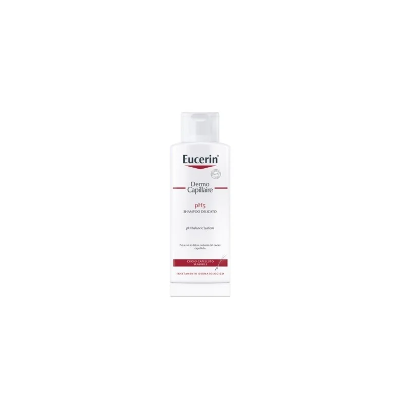 Eucerin Shampoo pH5 delicato è un trattamento per chi ha un cuoio capelluto sensibile. Deterge il cuoio capelluto e i capelli preservandoli da secchezza e irritazioni. Elimina i residui di sporco, polline e allergeni, mantenendo il naturale livello del pH della pelle. Lo shampoo è a base di Citrato PH5 (citrato di diammonio e acido citrico), che stabilizza il manto protettivo naturale e acido della pelle.