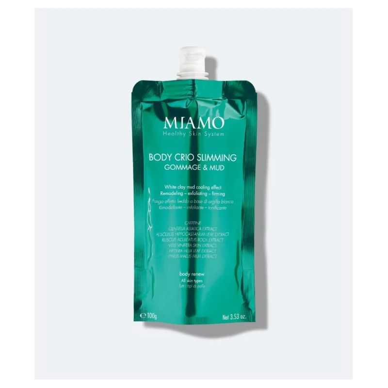 Miamo body crio sliming gommage & mud è un fango effetto freddo a base di argilla bianca per le gambe. Dona idratazione alla pelle e contrasta la cellulite.