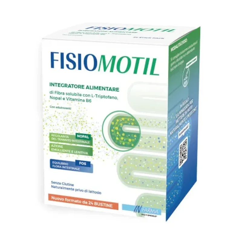 Nutraceutico costituito da un particolare complesso di fibre (frutto-oligosaccaridi a catena corta, Fibra di Guar depolimerizzata e fibra di limone), L-triptofano e vitamina B6, utile per colmare le carenze o gli aumentati fabbisogni di tali nutrienti. I frutto-oligosaccaridi sono utili per l’equilibrio della flora batterica intestinale, mentre la vitamina B6 contribuisce al normale metabolismo energetico. FISIOMOTIL è inoltre arricchito con il nopal, un estratto di fico d’India, dall’azione emolliente e lenitiva sul sistema digerente e favorente la regolarità del transito intestinale.