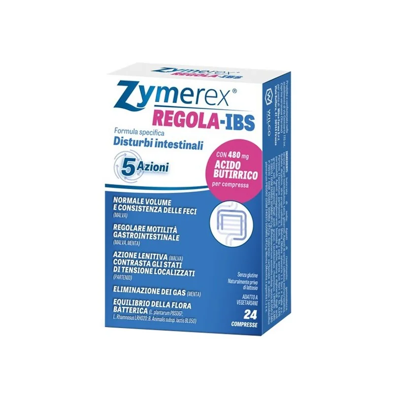 Grazie alla sua formulazione specifica, Zymerex Regola-IBS svolge 5 azioni sinergiche per favorire la normale funzionalità intestinale, inoltre, apporta circa 480 mg di acido butirrico per compressa.