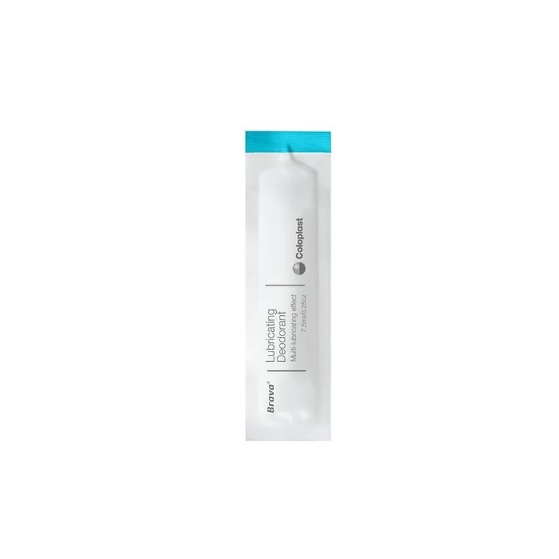 Brava Deodorante lubrificante maschera gli odori e garantisce che il contenuto rimanga sempre sul fondo della sacca e non attorno allo stoma. Inoltre, rende più facile svuotare la sacca. La bustina monouso è comoda da usare quando si è fuori casa o in viaggio.