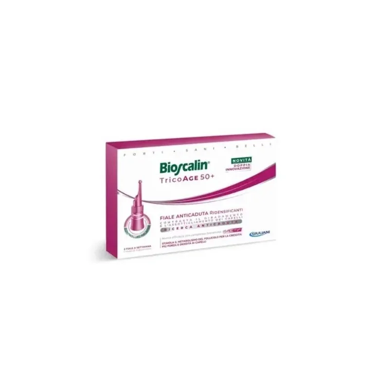 Bioscalin TricoAGE 50+ fiale è un trattamento coadiuvante ad azione anticaduta ed antietà ideato per i capelli della donna che tendono a diradarsi e ad indebolirsi dopo gli sbalzi ormonali della menopausa. La tecnologia brevettata di rilascio graduale degli attivi Triactive3 permette 1 sola applicazione ogni 3 giorni. Gli attivi penetrano fino al midollo del capello e vengono poi rilasciati gradualmente, garantendo così l'efficacia del prodotto per un maggior periodo di tempo.