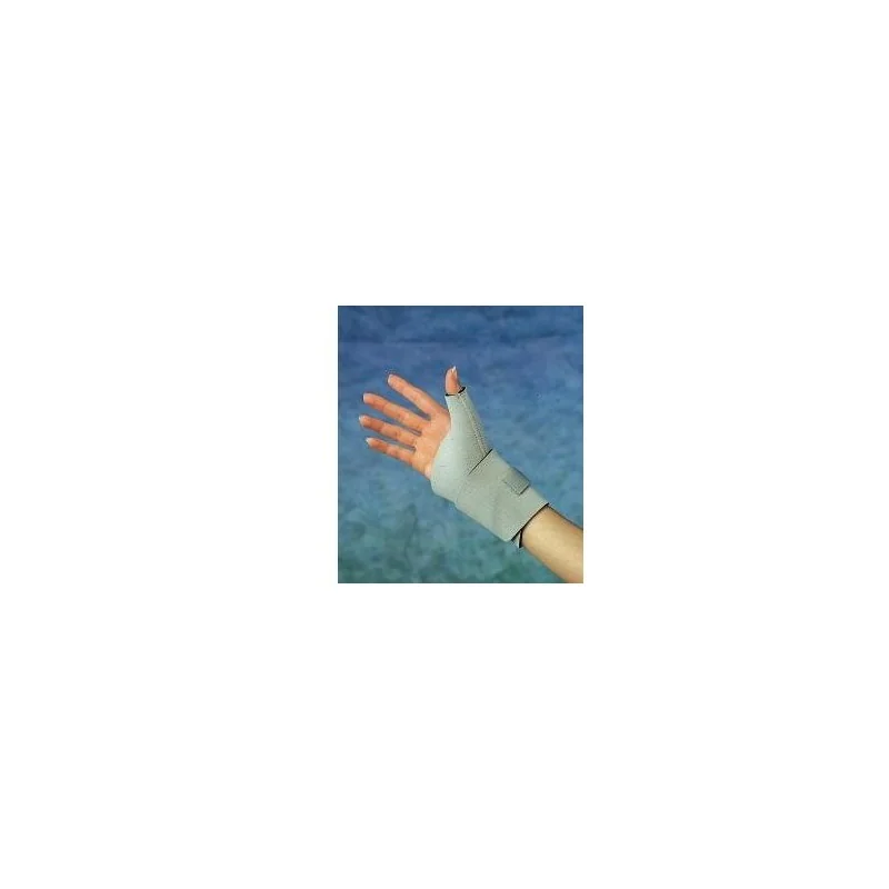 struttura in neoprene accoppiato con tessuto poliestere atossico, proiezione cilindrica per l'alloggiamento e la stabilità del pollice, chiusura a mezzo velcro.