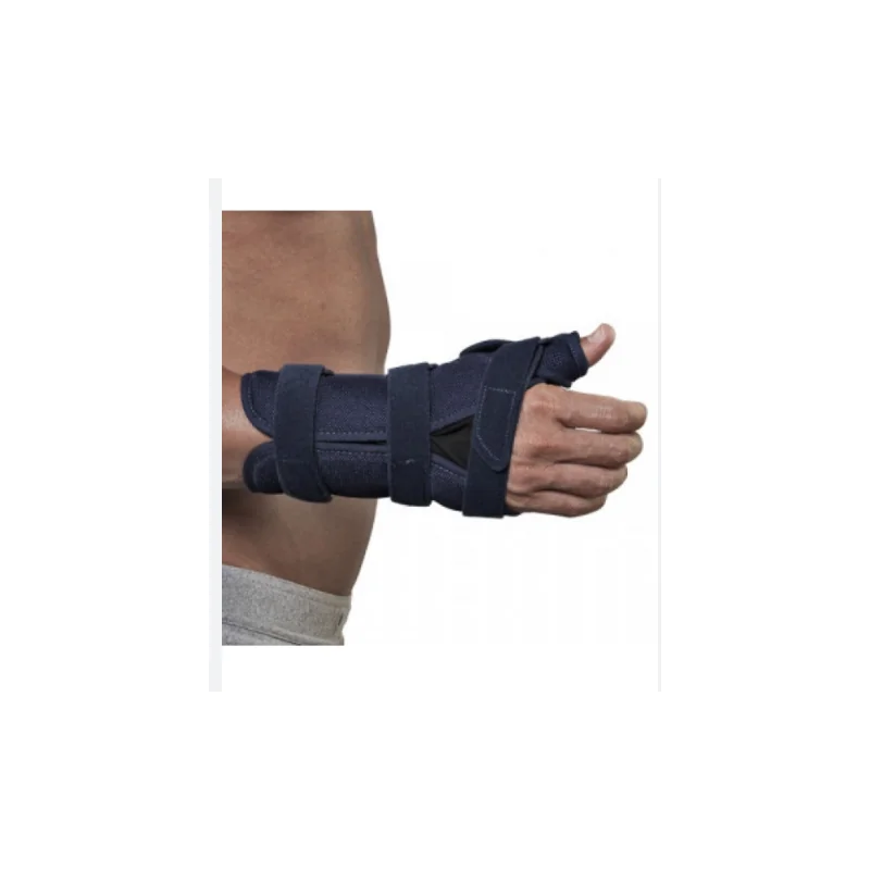 Ortesi per la stabilizzazione del polso e del pollice in posizione funzionale, mantenendo la mobilità delle altre dita e la prensilità della mano. Steccaggio palmare rigido e modellabile per l’immobilizzazione relativa del polso e steccaggio radiale rigido e modellabile per l’immobilizzazione relativa del primo raggio della mano. Confortevole fodera imbottita. Cuscinetto per il confort del palmo della mano. Tre cinghie di chiusura a strappo a livello di avambraccio, polso e mano. Linguetta a livello del pollice con chiusura a strappo.
