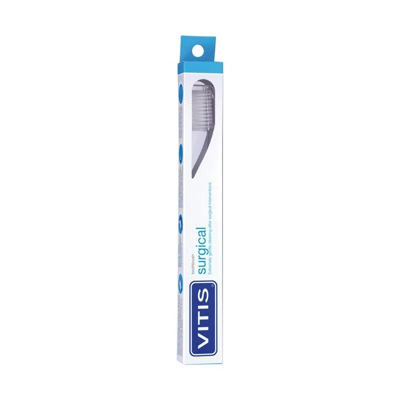 Lo spazzolino VITIS Surgical ha setole estremamente morbide, con un profilo dritto per un'igiene orale delicata dopo la chirurgia, evitando così infezioni o altre complicazioni. Lo spazzolino offre il grado di durezza indicato per la pulizia della bocca durante i periodi post-chirurgici (15 giorni dopo l'intervento), da utilizzare fino all'autorizzazione del dentista per tornare ad usare uno spazzolino normale. Il collo dello spazzolino VITIS Surgical è flessibile in modo da poterlo flettere fino a raggiungere la posizione che meglio si adatta alla cavità orale. Il manico è anatomico e con strie anti scivolamento per facilitarne l'uso e la comodità durante la spazzolatura. Dispone inoltre di un cappuccio protettivo della testina che mantiene le setole raggruppate e in ottime condizioni di igiene.