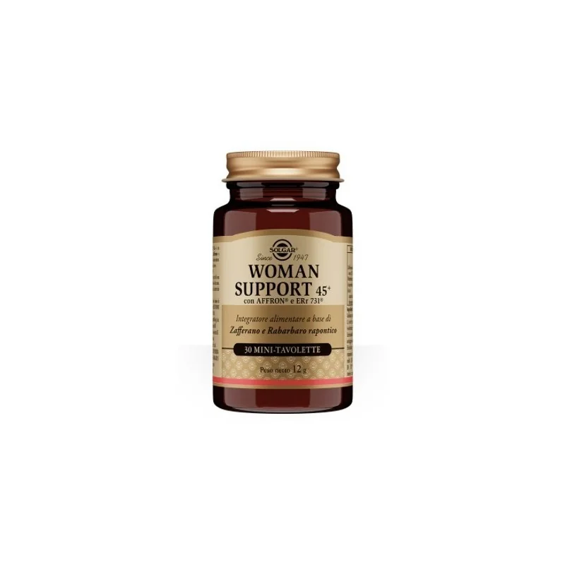 Solgar Woman Support 45+ Integratore per l'Umore è un integratore alimentare a base di zafferano (Crocus sativus L., stimmi) e rabarbaro rapontico (Rheum rhaponticum L., radice) formulato per donne mature. Lo zafferano favorisce il normale tono dell'umore.